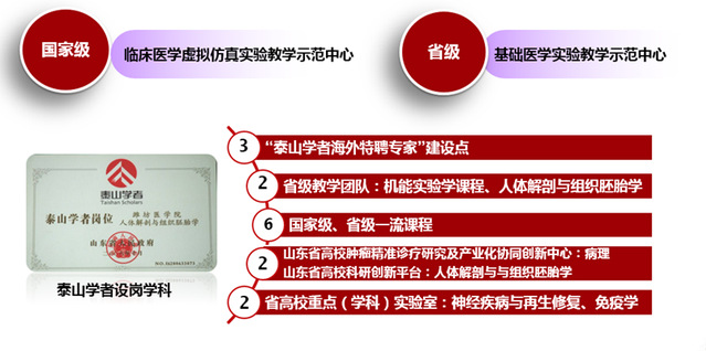 基础医学院是学校医学教育与研究的重要基地,始于建校之初的1951年,主要负责全校医学及医学相关专业本科生、研究生、留学生的基础医学及部分公共课程的教学工作,负责基础医学一级学科和重点学科及重点实验室建设。学院现有医学教研室9个、实验室4个,工学教研室3个、实验室2个。现有山东省“泰山学者”设岗学科1个,山东省肿瘤精准诊疗研究及产业化协同创新中心1个,山东省高校重点学科(实验室)2个。拥有国家级虚拟仿真实验教学中心1个,山东省基础医学实验教学示范中心1个。现有医学一级学科硕士点1个,二级学科硕士点8个。